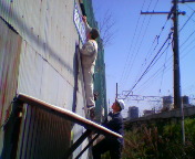 今日一番大変だったのはJRの線路沿いにある看板。位置が高く足場が悪いから。坪倉さん、北原さん、ありがとうございました。