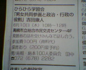 6月10日(木)10:00〜12:00(於:総合市民交流センター)、「平和と男女平等」高槻・島本100人委員会(ひらひら)からのお招きで30分ほど講演させていただくことになりました。その後、皆さんとのディスカッション・タイムだそうです。妻に「シティライフ(東版6月号)に載ってたわよ」と言われて「えっ!」。ほかのミニコミ誌にも出てたとの噂も。インターネットで慌てて検索してみたらヒットしちゃう。緊張してきた。しっかり勉強せな。写真はシティライフへの掲載部分。
