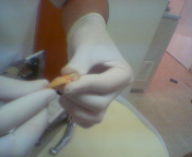 今、抜けたところです。4月26日、5月11日のログでご報告した1本目に引き続き今日は下の犬歯を抜きました。松本先生が予想しておられたとおり今回のほうが前回より大変でした。2針、縫っていただきました。