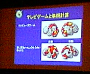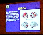 人間の活動と脳(主に前頭前野)の働きとの関係について演壇正面のスクリーンでわかりやすくご説明いただきました。写真のプレゼンテーションでは、テレビ・ゲーム(上)より単純計算(下)をしている時のほうが脳の働きが活発だという実験結果が示されています。