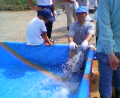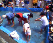 こちら小学生対象の鮎のつかみどり。