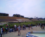 今日の芥川美化奉仕会は鮎のつかみどり大会です。JR鉄橋南側の芥川で。準備が始まりました。
