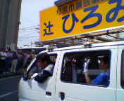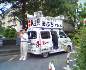 選挙宣伝カーの出発です。辻さん、1週間がんばって下さい!。