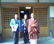 納経堂玄関前で(右から)ご住職、吉田康人の父とともに記念撮影(撮影:吉田康人の妻)。本日は、ご祈祷いただき、また、お札や厄除の数珠などをお授け下さり誠にありがとうございました。