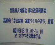 4月10日(日)「政策発表会」でもミニ・コンサートをして下さるメンズアクティが出演。地元のPTAのOBというだけあって声援してる観客が多かった。アリスの曲を中心に練習の成果を見せて下さいました。