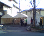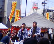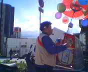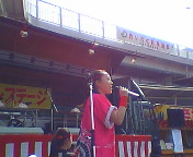 天神まつり翌日。体の節々が痛く疲れもだいぶ残っていましたががんばって辻説法。今回は富田方面3箇所で。写真は、西町の茨木市との境にあるスーパー「まねき屋」前で吉田康人後援会街頭演説キャラバン隊の上野隊長。