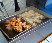 芥川小学校PTA・OBは水餃子、唐揚げ、お茶、ジュースなど。唐揚げはバイオ藤岡さんの特製です。昔のバイト経験が活かされているそうです。最近なかなか食べられなくなったやわらかくてジューシーな唐揚げです。