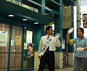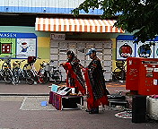 阪神「尼崎駅」前へやってきました。駅前の「一等地」をパフォーマンスのかたがたに占拠されていました。