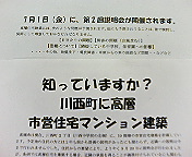 本年6月2日・20日の「やすとログ」でお伝えしてきた高槻市営川西住宅の建替計画。昨日7月1日(金)に行政からの説明会が催されたとのことです。予想どおり、「説明会を開催した」という既成事実だけが高槻市役所には必要だったようで、住民からの具体的なご質問(6月2日の「やすとログ」参照)に対して高槻市役所はほとんど具体的に回答できませんでした。