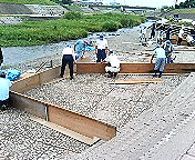 鮎を放つ人工水溜りを河原に作るため木枠を組んでいきます。