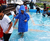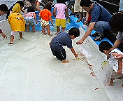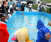 幼児は別のプールで(小さい網での)金魚すくい。雨で参加者が少なかったのでずーっとやってた子も多かった。途中、鮎が数匹放たれた時はみんな大喜びでした。
