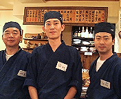 写真中央は料理長の藤井さん。藤井料理長は修業時代、高槻のお寿司屋さんで働いておられたことがあり、大阪ミナミのど真ん中でローカルな話題に花が咲きました(笑)。
