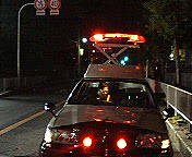 竹田さんとの長〜い語らいのあと高槻へ戻ってきたところでアクシデントに遭遇。国道171号線からロイヤルホストがある「清福寺交差点」を左に入り最初の信号。赤信号で停止していた乗用車、これは竹田さんと吉田康人が乗る車の(原チャリを挟んで)1台前を走っていたのですが、この車に原チャリが後ろから激突、転倒。原チャリのにいちゃんはうずくまってしまいました。「こりゃ、エライこっちゃー」と竹田さんと2人で車から降りたところ、乗用車も原チャリも相当破損してはいましたが原チャリにいちゃんは打撲と擦り傷程度で大丈夫でした。よかった、よかった。
