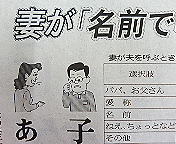 11月27日付「日本経済新聞」にミキハウス子育て総研の調査結果が掲載されていました。調査対象は20歳代後半から30歳代です。みなさんはご自分の夫または妻のことを何と呼んでおられますか?。吉田康人は?。それは内緒です(笑)。調査結果(複数回答)は下記のとおりです。