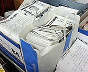 ポスター貼付のお願いに上がると一言で申しましても「小道具」がいろいろ必要です。ポスターそのものはもちろんですが、貼付作業のために必要なロープ、はさみなどの文房具、ご不在だった時に投函させていただく連絡票など約20種類の道具を各お宅まで持参します。今日も、まず、吉田康人が配付物を半日かけて印刷し、その後、吉田康人がポスター貼りにうかがっている間、スパボの塩谷さんと前川さんが事務所でグッズの作成、準備に汗をかいて下さいました。連携が徐々にとれてきました。ありがたい限りです。