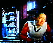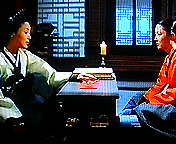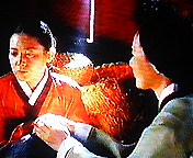 「親友の形見」の包丁を授けるハン・サングン(ヤン・ミギョン)と受け取るチャングム(イ・ヨンエ)。お互い、これがチャングムにとって「母の形見」であることをまだ知りません。