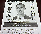 それにしても、日が暮れるのが実に早くなりましたねー。吉田康人は、方向音痴ということもあり、17:00で既に辺りの景色が見えなくなるとポスターご協力のお宅を発見することが困難になり悲しくなります(T_T)。