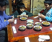 妻の「ジャスコへ1年ぶりに行きたい」、息子らの「ボーリングとコインゲームがしたい」との利害(?)が一致し上牧のジャスコへ行きました。妻がウインドー・ショッピング(結局、買いたい物が何もなかったらしい)している間に「1ゲームだけ。おじいちゃんからもらったお年玉を使ってね」という約束でボーリング。ジャスコのボーリング場は40分〜1時間待ちで混んでいました。お昼間の百マス計算競争と同様、ボーリングでも3人の息子らに「完勝」しました。まだまだ負けられません(笑)。
