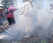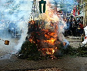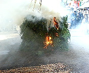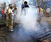 吉田康人がご奉納したものを含め参拝者のお札がくべられていきます。この写真はよく撮れていますが焚き初めは風向きが悪く煙がぼうぼうと吉田康人が立っているほうへ流れてきました。ほとんど何にも見えませんでしたし涙ボロボロ。