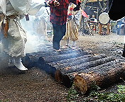 護摩焚きで焼かれた木(炭)が並べられ火渡りが行なわれました。