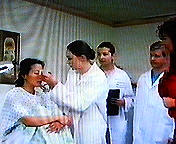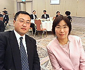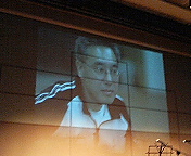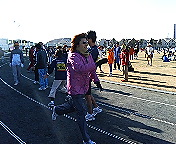 実は、ボランティア・スタッフが谷川さんが競技場へ入場しやすいように人垣を整理して待ち構えていました。でも、なかなか来ない。群衆をそう長いあいだ待たせることは困難です。体育館から競技場への通路(昨年、野口みずきさんはここから走ってきた)を覗きにいきましたがいない。スタッフも騒ついてきた。困ったなぁ〜。すると、吉田康人の後ろにご覧のような「らしき」女性が。これじゃ、わからんわねぇ。