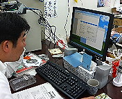 出張から帰ってこられたばかりの竹田さん(写真)が早速、立ち上がらなくなった吉田康人のパソコンを見に来て下さいました。「下さいました」というのは水臭いなぁ〜、中学、高校の同級生だから(笑)。