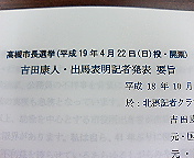 配布資料は、終日忙しかったので深夜になりましたが、完成しました。記者発表する内容のうち「やすとログ」と関係が深いことと言えば、「高槻市政政権マニフェスト70」へのご意見、ご要望をインターネットを通じてお承りし、ネット上で討論もしていただくことでしょうか。どうやったらその討論の「場」へ参加できるかは暫く内緒です。体制がまだ充分整っていないので(笑)。でも、新聞に出ちゃったら困るなぁ、ハハ(^_^;)。