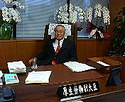 接客用のソファで吉田康人の近況報告などいろいろお話しさせていただいたんですが、お願いして副大臣の椅子に座っておられるところを撮らせていただきました。