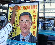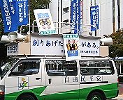 吉田康人後援会は「街頭演説キャラバン隊」を組織しています。キャラバン隊では、ボランティア・スタッフにもマイクを握っていただいて吉田康人の代わりに演説をお願いすることもあります。吉田康人はその間、演説台(=ビール・ケース)を降りて自らの政策チラシを一枚一枚、道ゆく市民のみなさんへお配りしています。