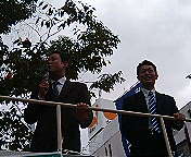 「関西若手地方議員決起の会」代表幹事で寝屋川市議会議員の南部はじめさん(1枚目の写真左)、摂津市議会議員のしまの浩一朗さん(同右)とともに応援演説開始。