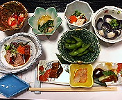 写真は前菜ですが、くじら、牛肉のたたき、うなぎ、白子など前菜だけで多彩な料理を実に美味しくいただけます。