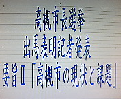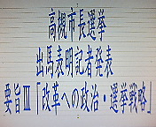 (4)この度、次期市長選挙まで残り半年となったこの時点で、@私自身はもちろん、私の支援者各位の上記「志」に些かも揺るぎがないことを再確認できた、そして、A新しい高槻市政の具体的ビジョンである「高槻市政政権マニフェスト70」の作成が順調に進んでいる――といったことから、次期市長選挙へ再チャレンジすることを表明させていただきます。
