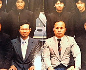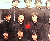 同じく卒業アルバム。中段左から2番目が吉田康人。先生は向かって左側が高校3年生時の担任、和泉先生。右が永尾先生(同窓会出席)。若い!(笑)。