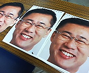 それにしても、若者の力、発想にはエネルギーを感じます。「負けソ」と思う時もあります。ふと見ると、事務所テーブルの上に吉田康人の顔写真が何枚も置かれています。いったい、何が始まるんだろー?(笑)。