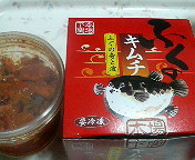 「チームやすと」のムードメーカーのひとりであるキャサリンから「ふくキムチ」をいただきました。文字どおり、フグの皮と身が、ダイコンをベースとするキムチに混ぜられています。キムチは元来、シーフードで味に広がりを持たせる食べ物でもあるのでフグとの相性もいいですね。それに、皮と身の両方が入っているところがミソでフグの歯ごたえも2通り楽しめて嬉しい。