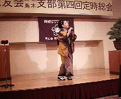 懇親会が始まりました。各種挨拶・報告の後、宴会のトップバッターは地元の演歌歌手、結城彩さん。結城さんは母校の家庭科の先生でウチの長男も昨年度までご指導いただいていました。