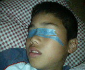 ゆうべ、先に寝ていたウチの三男(小学6年生)。お兄ちゃんらの机のライトが眩しかったのでテープを貼ったみたい(笑)。