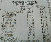 町村や大阪市を除くと池田、守口に次いで大阪府下で3番目に子供が少ないことになり、さらに、子供の減少率(減る勢い)は池田、守口より高槻のほうが大きかったので、高槻市が子供がいかに少ないまちかということがご理解いただけると思います。