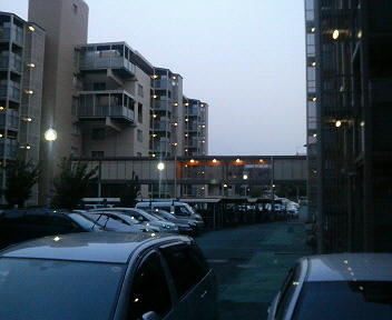 漸く、空が明るくなった中を朝起会へ出掛けられる季節となりました。写真は玄関から見た夜明け前のウチの団地です。
