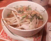 春巻系、餃子系、肉団子系、サラダ系、肉系の料理の後、料理の締めは鶏肉のフォー。具の下に透明感がある麺が隠れています。