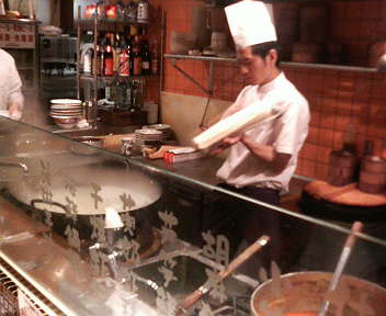 カウンターに座ると刀削麺をつくっている(麺をまさに削り飛ばしてゆで鍋へ入れる)ところを見ることができます。