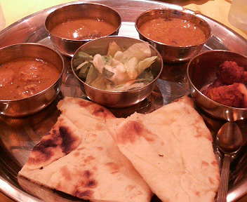 お店の人はみんなインド人(のようです)。インド映画の映像も流され本場インド・カレーが1000円で食べ放題。しかも、平日は混雑しているのですが、土曜日とあって赤坂オフィス街はガラガラ、このお店も貸し切り状態でした。
