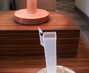 容器にソフトクリームを注いだ後、キットカットなどの「具」(笑)を入れそれをかき混ぜてマックフルーリーは作ります。スプーンはかき混ぜ作業に使われているのです。容器に収められたソフトクリームに突き刺したスプーンをガリガリ(←店員さんの表現です(笑))と回転させてかき混ぜるんだそうです。その回転させる機械に引っ掛けるためのフックがこれ、です。