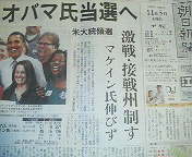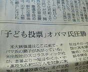 品川までの新幹線で過去の新聞を読み返していました。目に留まったのは、米国で、本当の投票に先立って子供達に投票させたところここでもオバマ氏が圧勝していたという記事。何と、1964年以来ずっと、「子供投票」の当選者と実際の大統領選挙の当選者とが一致してきたそうです。