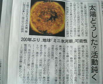 本日の「朝日新聞」夕刊によると、太陽の活動が200年ぶりの低水準にまで落ちこんでいるそうです。研究者も「このままだと地球はミニ氷河期に入る可能性がある」と慌てていて、国立天文台は今月下旬、研究者を集めた検討会を開きます。