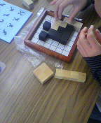 三つめは、「絵づくりパズル」。様々な形の木片を組みあわせて動物などの絵をつくります(写真)。