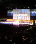 来賓や先生がたが壇上、学部生がアリーナ、大学院生と保護者がスタンド席という座席配置。どこもビッシリでした。
