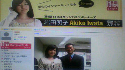 インタビューしてくださった岩田明子さんのブログ( http://akiko-iwata.blog.so-net.ne.jp/2010-04-23 )に載せていただきました!。岩田さんは、横浜市立大学4年生。同大学ミスキャンパス2009で第6期So-netキャンパスサポーターズの一員でもいらっしゃいます。