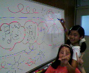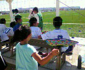 いつも、スタッフが足りない時は測定が終わった子供達にストップウォッチ係や金メダルシール貼り係などでお手伝いしてもらいます。今回は北川さん、藤村さん、佳代さんなどスタッフが充実。測定に飽きた子供達はお絵描きを始めました(笑)。