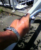一昨日(水)、昨日(木)、今日(金)と、ホンマに暑いねぇ〜。昨日の朝の駅頭活動は直射日光、炎天下で2時間立ちっぱなしでした。冗談じゃなく(笑)、倒れそうになりました。給水量は1リットルでした。すべて汗として放出、残ったのは顔の黒さだけ(笑)。